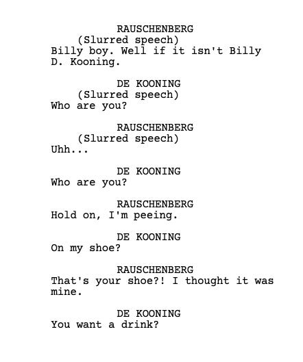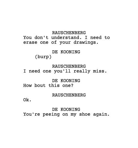 So Robert (probably still drunk) went a-pounding on the studio door of the probably drunk Willem De Kooning. Here is their imagined conversation:
